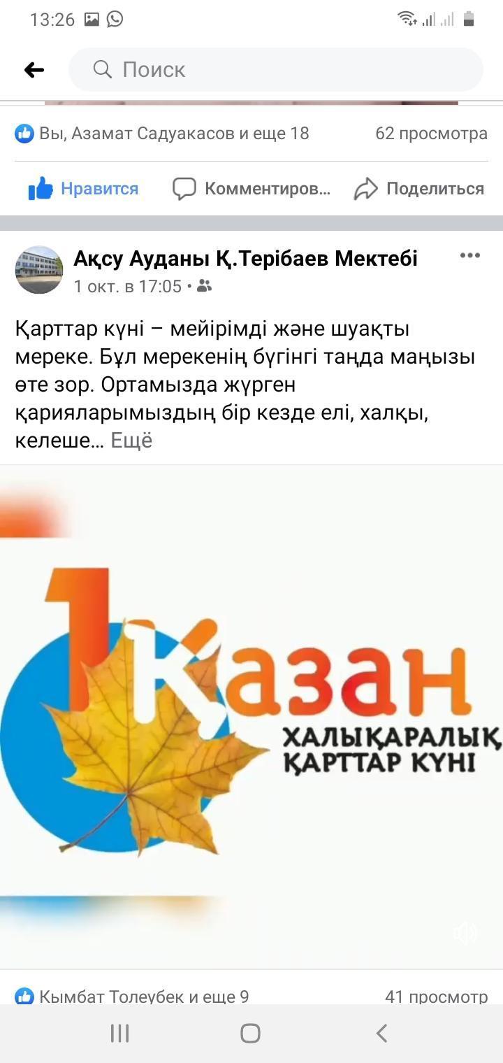 Халықаралық қарттар күні » "Қуат Терібаев атындағы орта мектебі, мектепке дейінгі шағын орталығымен" коммуналдық мемлекеттік мекемесі