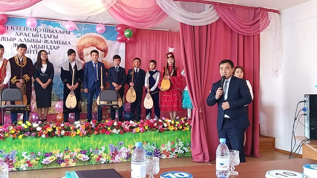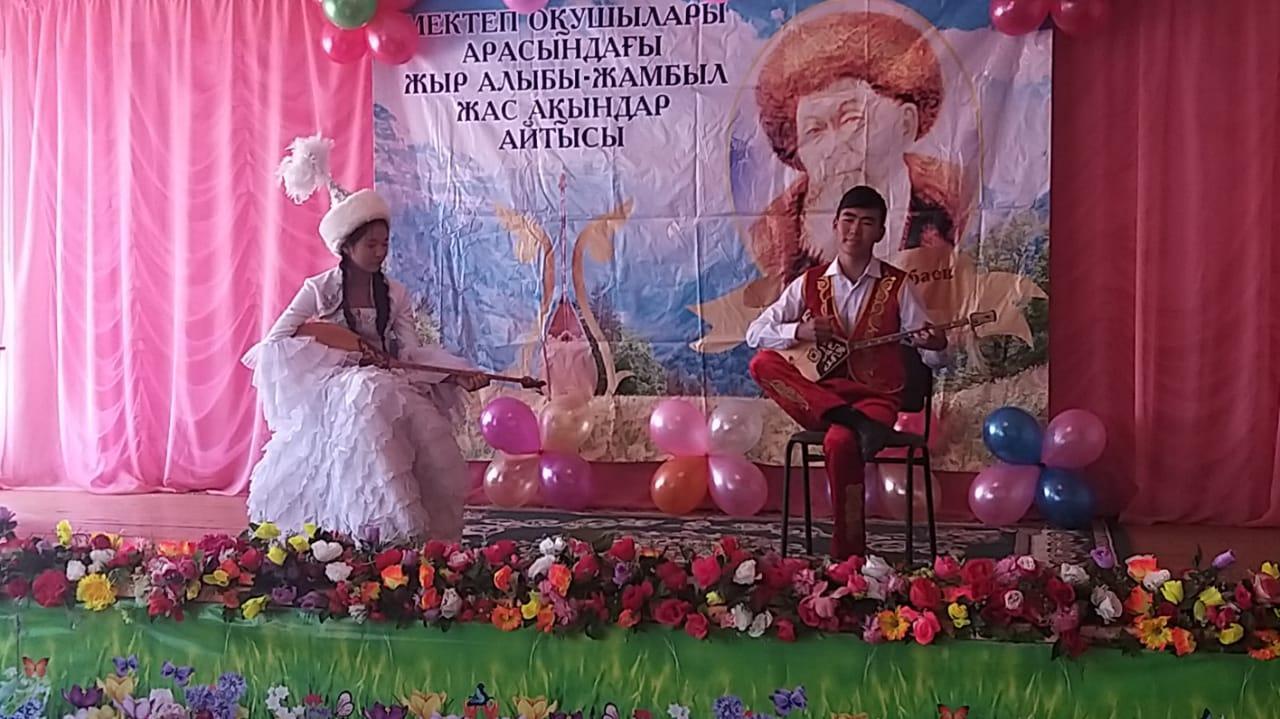 30 октября прошел районный айтыс Жамбыл Жабаева среди учащихся.Целью данного мероприятия является поддержка и развитие импровизаторского жанра – айтыс, пропаганда песенного искусства, выявление талантов среди учеников и привитие патриотизма подрастающему поколению. Победитель айтыса будет состязаться среди молодых акынов области